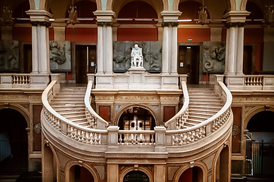 Каждый зал Академии — это не просто помещение, а театральная сцена, где главную роль играют стили и время. Архитектор Максимилиан Месмахер задумал их так, чтобы студенты могли изучать эпохи буквально изнутри. Сегодня мы идём тем же маршрутом, что и они — от античных форм до барочных завитков.