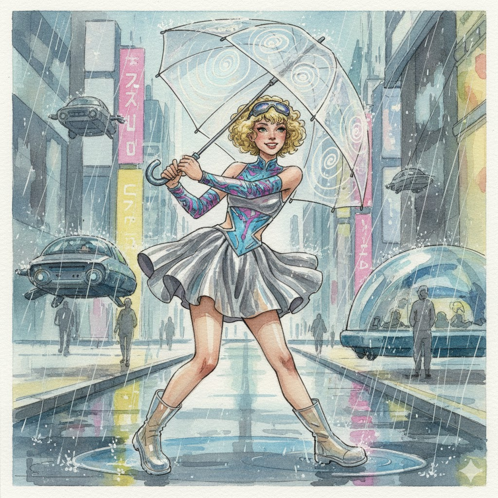 Генерируем картинки в https://gemini.google.com/ Продолжаем щупать возможности Banana, а начинали тут. И сегодня отправимся в недалекое будущее. Watercolor drawing of a pretty, sensual young European woman, short fluffy hair, very open mini, playful outfit, stand, energetic pose, slightly leaning forward in an open pose, rubber boots, holding tightly to the handle of an umbrella with both hands, it's raining all around. The umbrella is slightly tilted back against the background of a rainy daytime street. The action takes place in the 50s of the 21st century Прикольно. Но транспорт явно из более далекого будущего. Попробуем перегенерировать запрос. Ну как-то вообще не будущее. Хотя осталось 25 лет, вряд ли у нас появятся летающие тарелки. Так что это более реалистичный вариант. Обращу внимание, что каждый раз запрос был запущен в новом чате именно благодаря этому картинки получались непохожими друг на друга. И совершим прыжок в 23 век. "The action takes place in the 23st century". Ба