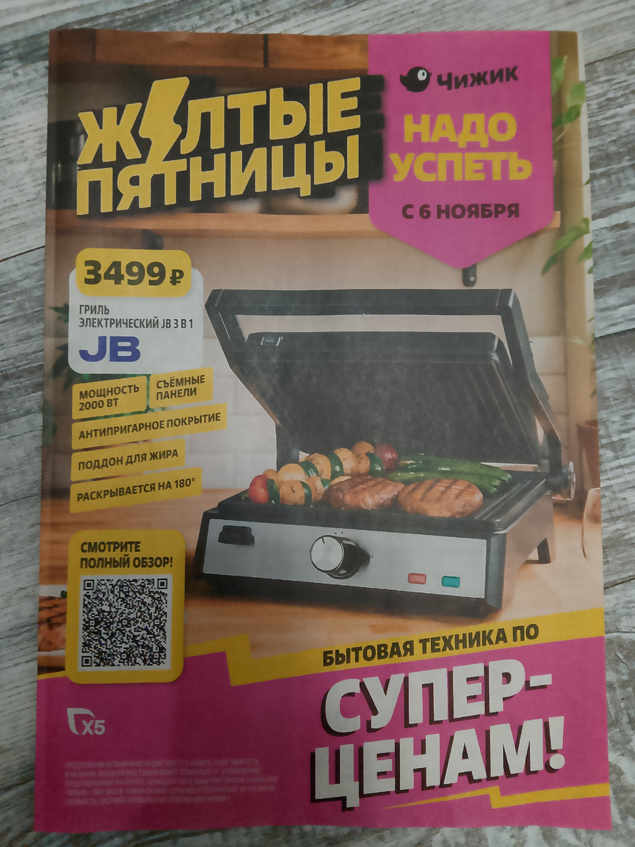 Приветствую вас, мои дорогие друзья и подписчики. Жёлтые пятницы. Бытовая техника по супер-ценам. Гриль электрический JB, Съемные панели, антипригарное покрытие, поддон для жира Успейте купить выгодно! Успейте купить выгодно! Техника по суперценам Товары для дома Одежда Красота и уход Этот текст предназначен для информирования читателей о том, что изображения на канале не являются рекламой. Автор статьи предупреждает, что не рекомендует те или иные товары к покупке и не несёт ответственности за их качество.