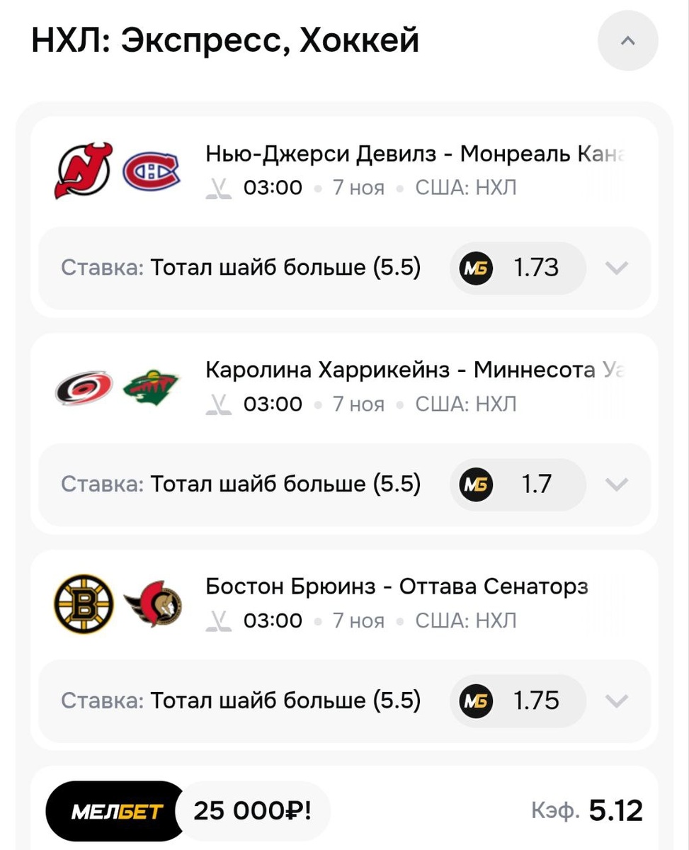 Выбрали для вас мощный экспресс на НХЛ с кэфом 5.12 🏒 ✅ Нью-Джерси-Монреаль Ставка: ТБ 5.5 шайб Тотал больше 5.5 шайб сыграл в 5 матчах команды Монреаль Канадиенс подряд (НХЛ) ✅ Каролина-Минесота Ставка: ТБ 5.5 шайб Тотал больше 5.5 шайб сыграл в 6 домашних матчах команды Каролина Харрикейнз подряд ✅ Бостон-Оттава Ставка: ТБ 5.5 шайб Тотал больше 5.5 шайб сыграл в 6 гостевых матчах команды Оттава Сенаторз подряд (НХЛ) Собери свой экспресс ✅ Забери фрибет 🔝