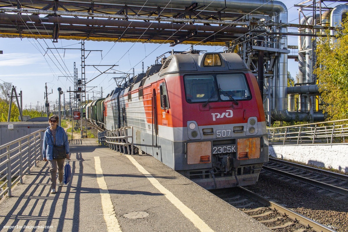 До платформы мы доехали достаточно быстро на местном троллейбусе, а вот проход к ней предстоял через небольшую промзону. Да и сама платформа находится в таком же районе, но не идти же назад? Минут за 5 дошли и нашли проход. Платформа пустынная, явно рассчитана на электропоезда составностью 8-10 вагонов. Не успев присмотреть место, как со стороны Владимира потянулся первый поезд — грузовой под тягой 2ЭС5К.