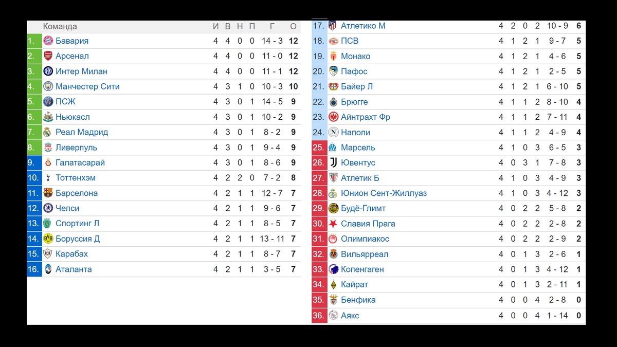 - Три клуба идут без потерь - Бавария, Арсенал, Интер, по 12 очков.