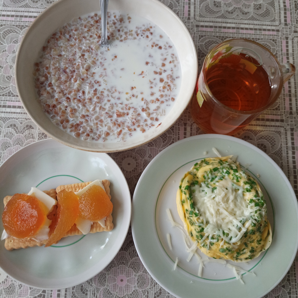 Поэтому сегодня и завтрак был ранний. Вместо геркулесовой каши сегодня гречка. Омлет из двух яиц, я его наловчилась готовить в микроволновке. Чай и печенье с маслом, сверху моё любимое теперь мармеладное повидло.