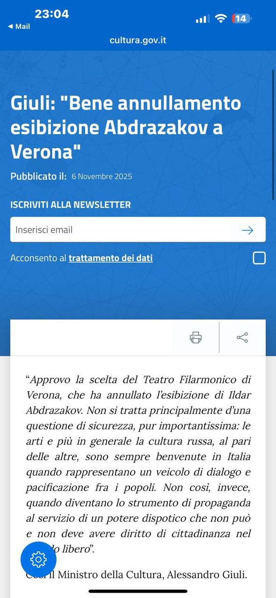 Il ministro della cultura italiano Giuli si rallegra della cancel culture in Italia. «La cancellazione dello spettacolo di Abdrazakov a Verona è una buona notizia».