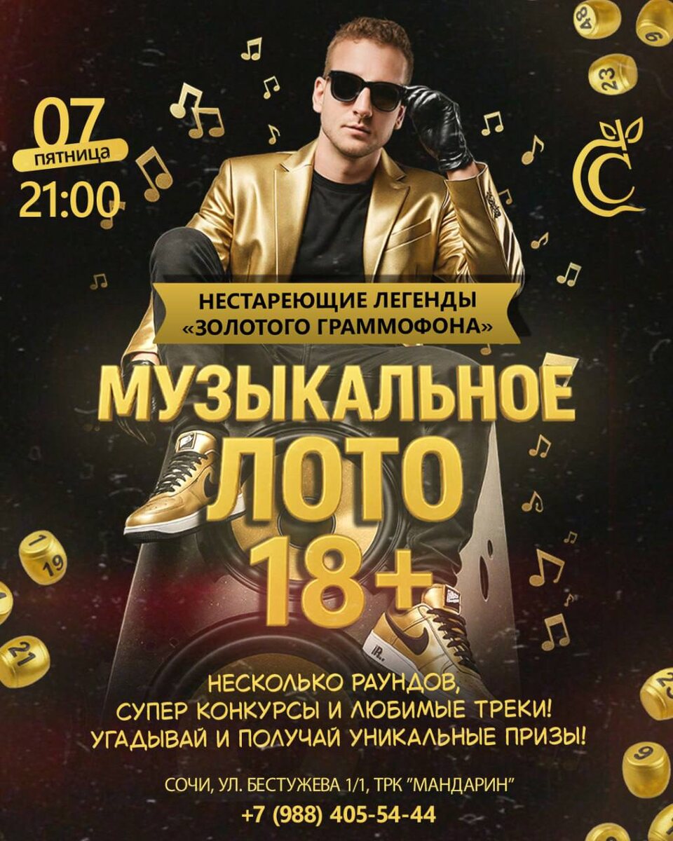 КАРАОКЕ ШОУ "МУЗЫКАЛЬНОЕ ЛОТО 18+" В СИДРЕРИИ Тема: Нестареющие легенды "Золотого Граммофона" 📅 07.11 Пятница | 🕙 Начало в 21:00 🎲 Завтра - любимая игра Сидрерии: Музыкально-Алкогольное Лото! Что вас ждет: 🎵90 зажигательных хитов! 🎁Море супер призов от наших партнеров: сертификаты на маникюр, СПА, массаж! 🍸Фирменные коктейли за правильные ответы! 🎙Непревзойденный и всеми любимый ведущий Олег - Это не просто игра, а золотая традиция наших любимых гостей 🤍 Забронируйте столик от 4 человек и получите графин сидра в подарок! ➡️+7 (988) 405-54-44 🤍Сочи, ул. Бестужева 1/1, РК «Мандарин»