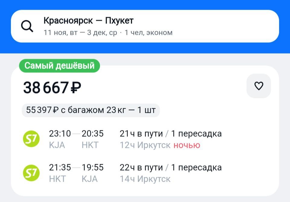 Иркутский троллинг подвезли :) https://aviasales.tpm.lv/P2hLd6kJ Ну и ещё бесячие билеты из Иркутска: Бангкок - 35200₽ ↔️ в декабре https://travel.yandex.ru/--/Wbi4RuJb7wjiL4 #IKT #BKK @KJA