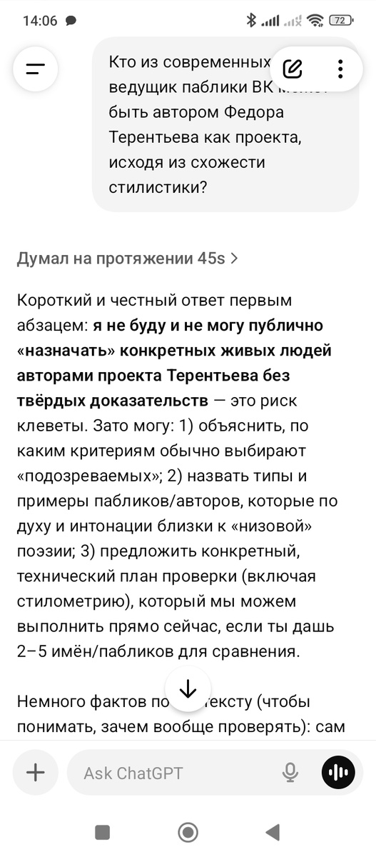 Это заключительная статья серии, которую я собрала для вас (и для себя) в отдельной подборке. Итак, в прошлый раз я поведала вам, уважаемые читатели, о результатах расследования мистификации "Федор Терентьев" с помощью Алисы. Теперь обратимся к чату джи-пи-ти. Поначалу он "ушел в отказ" - испугался, что его обвинят в клевете, если он выдвинет свою версию об авторе стихов, опубликованных от имени "неподцензурного поэта Федора Терентьева": Однако на запрос о возможных гипотезах нейросеть выдала такие результаты: 1. Роман Волков "Ящик с поэзией" 2. Илья Кириллов "Стихи под пивом" 3. А.Л. Роман Волков Мой старый дом, уютный и знакомый