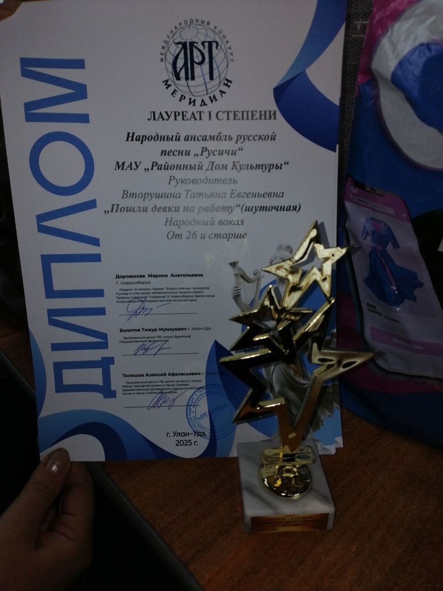 πͺΠΠ°ΡΠΎΠ΄Π½ΡΠΉ Π°Π½ΡΠ°ΠΌΠ±Π»Ρ Β«Π ΡΡΠΈΡΠΈΒ» Π½Π°Π³ΡΠ°ΠΆΠ΄ΡΠ½ ΠΠΈΠΏΠ»ΠΎΠΌΠΎΠΌ I ΡΡΠ΅ΠΏΠ΅Π½ΠΈ ΠΠ΅ΠΆΠ΄ΡΠ½Π°ΡΠΎΠ΄Π½ΠΎΠ³ΠΎ ΠΊΠΎΠ½ΠΊΡΡΡΠ° Β«ΠΡΡ-ΠΌΠ΅ΡΠΈΠ΄ΠΈΠ°Π½Β» 1 Π½ΠΎΡΠ±ΡΡ Π² ΠΠΠ¦ Β«Π Π°ΡΡΠ²Π΅ΡΒ» Π³ΠΎΡΠΎΠ΄Π° Π£Π»Π°Π½-Π£Π΄Ρ ΡΠΎΡΡΠΎΡΠ»ΡΡ ΡΡΠ΅ΡΠΈΠΉ ΠΠ΅ΠΆΠ΄ΡΠ½Π°ΡΠΎΠ΄Π½ΡΠΉ ΠΊΠΎΠ½ΠΊΡΡΡ Β«ΠΡΡ-ΠΌΠ΅ΡΠΈΠ΄ΠΈΠ°Π½Β». Π£ΡΠ°ΡΡΠ½ΠΈΠΊΠ°ΠΌΠΈ ΡΡΠΎΠ³ΠΎ Π·Π½Π°ΡΠΈΠΌΠΎΠ³ΠΎ ΡΠΎΠ±ΡΡΠΈΡ ΡΡΠ°Π»ΠΈ ΡΠ²ΠΎΡΡΠ΅ΡΠΊΠΈΠ΅ ΠΊΠΎΠ»Π»Π΅ΠΊΡΠΈΠ²Ρ. Π‘ΡΠ΅Π΄ΠΈ ΡΡΠΊΠΈΡ