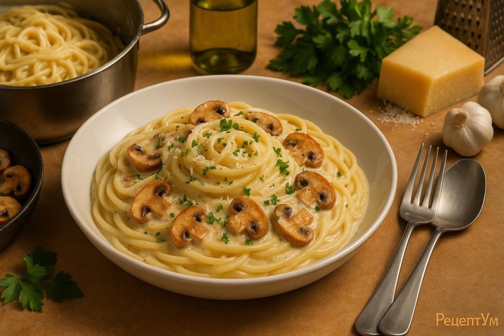 Выбирайте плотные белые шампиньоны без темных пятен — они дают лучший вкус и не выделяют лишнюю влагу. Мойте грибы быстро под проточной водой и сразу обсушивайте.Никогда не добавляйте масло в воду для пасты — это миф! А вот воду от варки обязательно сохраняйте — её крахмал творит чудеса с соусом.Экспериментируйте с грибами: белые, шиитаке, вешенки или смесь лесных грибов сделают блюдо еще интереснее. Главное — не переборщите с количеством, грибы должны дополнять, а не доминировать!