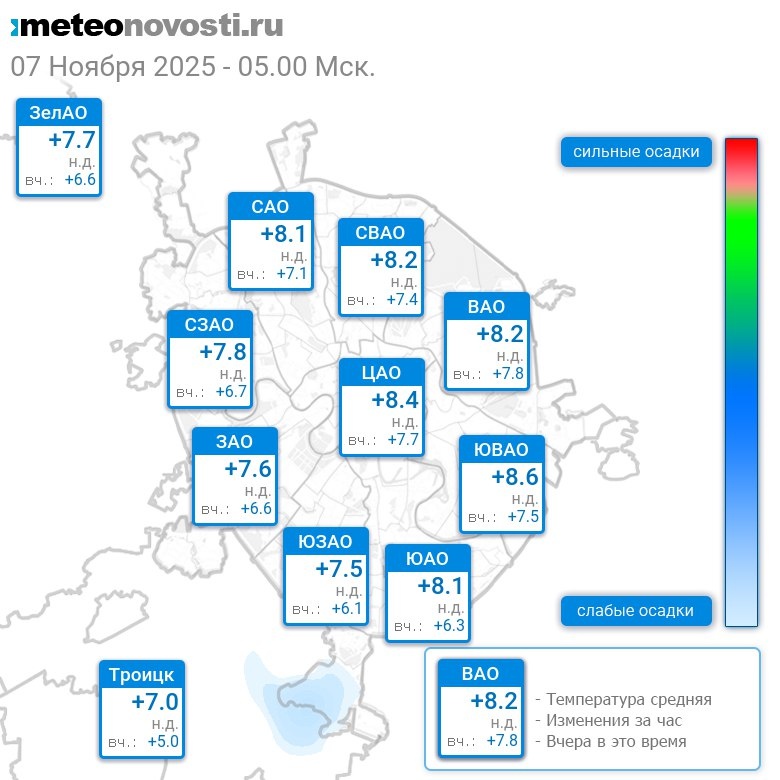 В 5:00 в Москве было от +6.7°C до +8.7°C, средняя температура +8°C #погода #Москва #осень #температура #7ноября #пятница Перейти на сайт Прогноз погоды на 14 дней