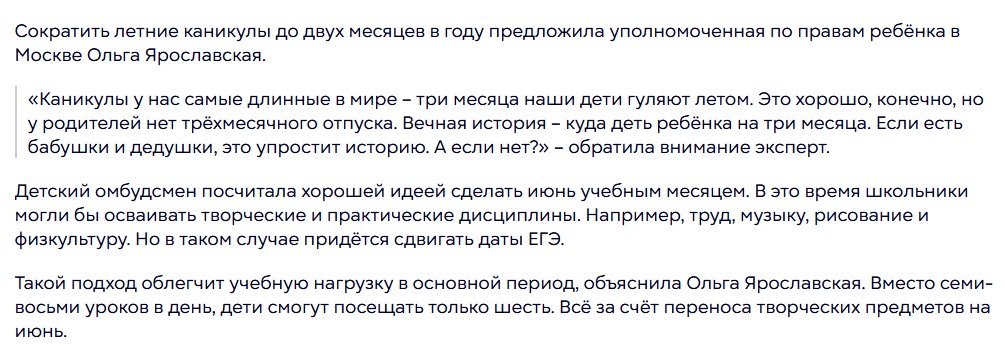 Открываю рубрику "Школа в курсе" для просмотра и обсуждения новостной повестки, которая затрагивает нашу сферу. И начну с нашумевшей в последние дни новости о сокращении летних каникул, о чем в одном из интервью сказала омбудсмен по правам ребенка г.Москвы Ольга Владимировна Ярославская. Новость вызвала очень бурную реакцию в сети и ее даже прокомментировал заместитель президента Российской академии образования Геннадий Григорьевич Онищенко. Очень приятно, когда люди, которые знают систему только снаружи, или совсем поверхностно, так пытаются о ней заботиться и как-то изменить. Давайте посмотрим стоит ли это делать. Летние каникулы, как многие знают, начинаются с конца мая и заканчиваются в начале сентября. Юридически это так. Что же на практике? Конец мая-июнь - это пора экзаменов, то есть время, когда школы и учителя довольно сильно загружены и вести образовательный процесс полноценно невозможно, особенно в тех школах, в которых проводятся экзамены. Во время экзаменов в школах орган