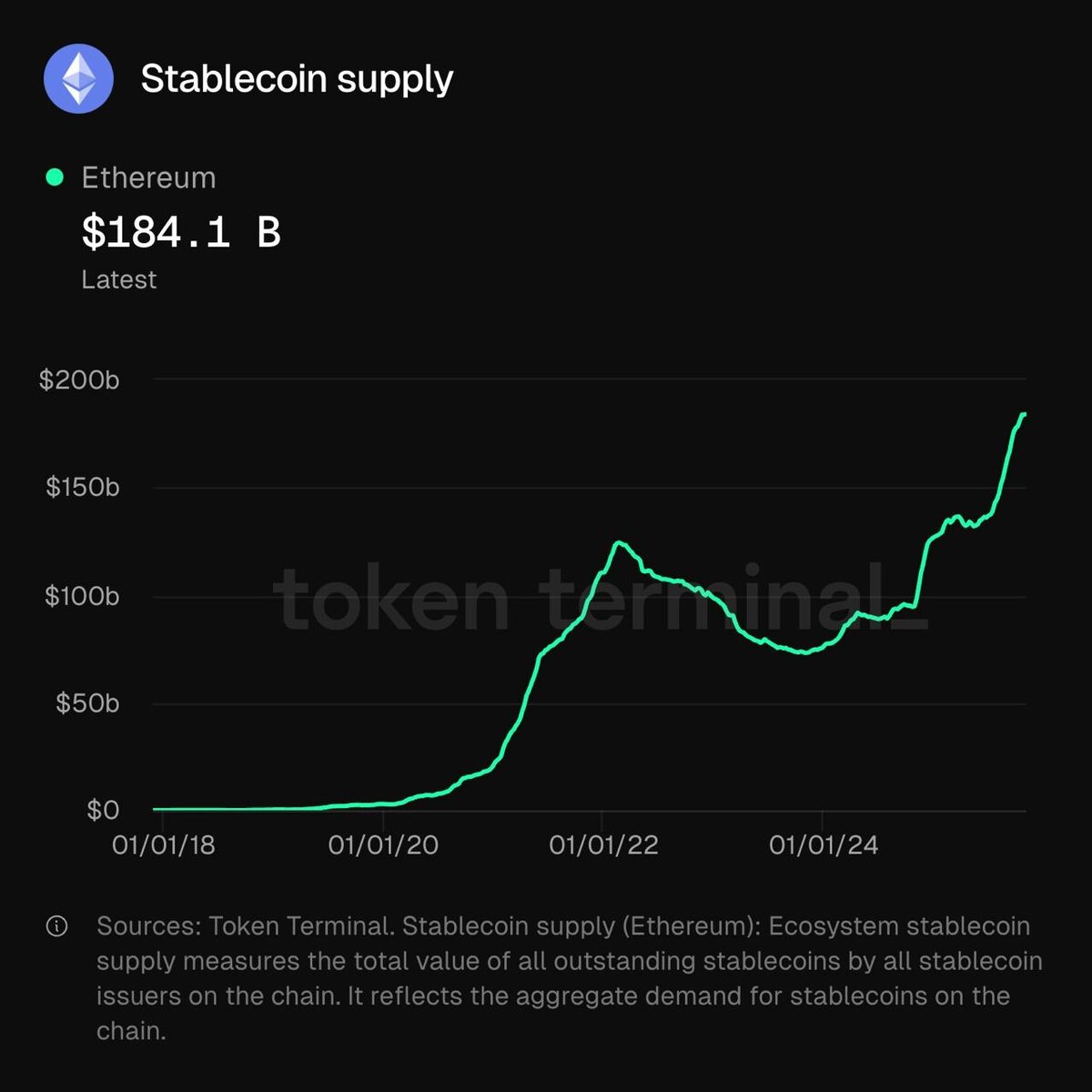 🔸Объем предложения стейблкоинов в Ethereum достиг $184,1 млрд, установив новый рекорд