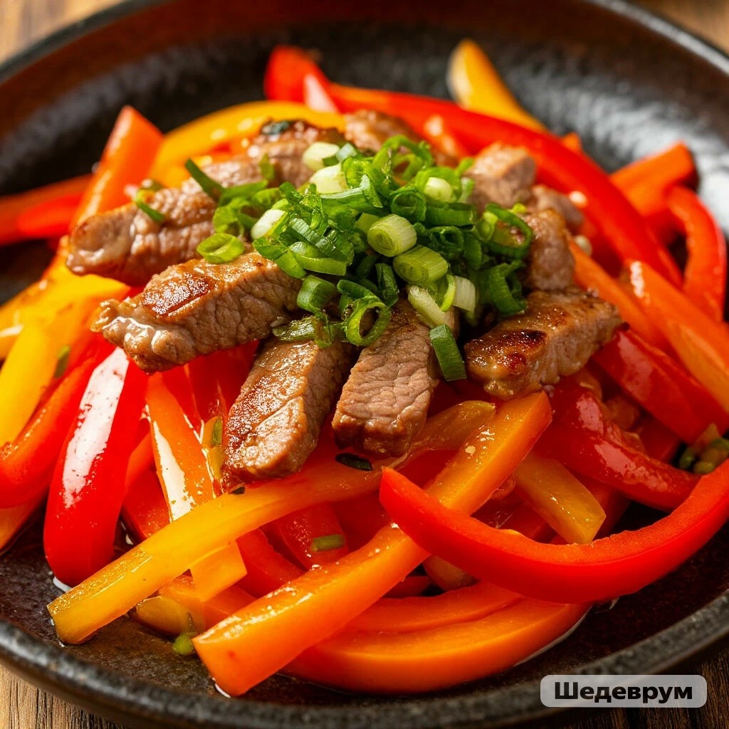 ### Ингредиенты: - Свинина: 500–600 г - Лук: 1 шт. - Морковь: 1 шт. - Болгарский перец: 1 шт. (желательно красного и жёлтого цветов) - Зелёный лук: пучок #### Для соуса: - Чеснок: 4 зубчика - Сахар: 1 ст. л. - Соль: 0,5 ч. л. - Чёрный и красный перец: по вкусу - Яблочный уксус: 1 ст. л. - Соевый соус: 5–6 ст. л. ### Приготовление: 1. **Подготовка овощей**: Лук нарезаем тонкими перьями, морковь — соломкой. Болгарский перец выбираем двух цветов (красный и жёлтый) для яркости блюда. Свинину нарезаем соломкой, а зелёный лук мелко шинкуем. 2. **Обжарка мяса**: На разогретой сковороде обжариваем свинину до золотистого цвета. Выкладываем мясо на тарелку и добавляем в сковороду лук и морковь, обжаривая их на том же масле. 3. **Добавление болгарского перца**: После обжарки лука и моркови до полуготовности добавляем болгарский перец и продолжаем жарить до полной готовности. 4. **Приготовление соуса**: В отдельной мисочке смешиваем соевый соус, яблочный уксус