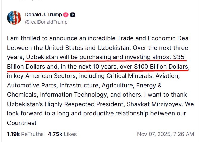 “Kelgusi uch yil mobaynida O‘zbekiston Amerikaning muhim sohalari, jumladan, muhim minerallar, aviatsiya, avtomobil qismlari, infratuzilma, qishloq xo‘jaligi, energetika va kimyo sanoati, axborot texnologiyalari hamda boshqa tarmoqlarga deyarli 35 milliard dollar, keyingi 10 yil ichida esa 100 milliard dollardan ziyod investitsiya kiritadi va xaridlarni amalga oshiradi”, deb yozdi Tramp. @daryolive