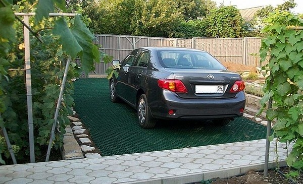 Это тот самый «пластмассовый настил с дырками». Он представляет собой модули из прочного пластика, которые соединяются в единое полотно. Ячейки засыпаются грунтом и засеиваются травой.