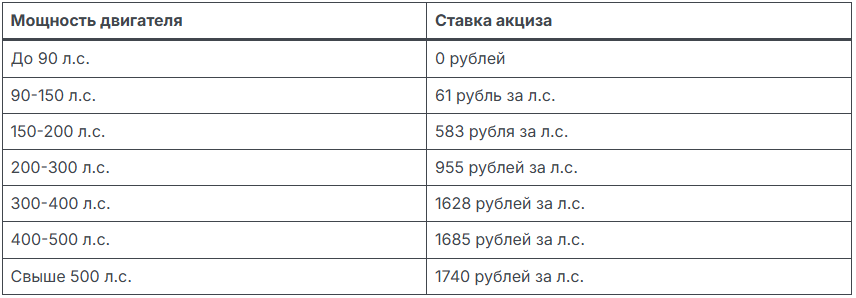 Мощность двигателяСтавка акцизаДо 90 л.с.0 рублей90-150 л.с.61 рубль за л.с.150-200 л.с.583 рубля за л.с.200-300 л.с.955 рублей за л.с.300-400 л.с.1628 рублей за л.с.400-500 л.с.1685 рублей за л.с.Свыше 500 л.с.1740 рублей за л.с.
