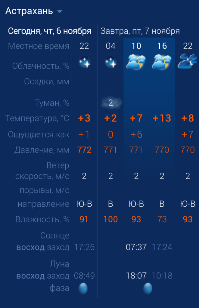 7 ноября в Астраханской области будет достаточно свежо. Ночью возможен туман. Утром температура воздуха в городе составит +7 градусов. Днем температура повысится до +13. К вечеру похолодает до +8. Астраханцев ждет восточный ветер со скоростью 2 м/с. Атмосферное давление составит 770 мм рт. ст. Влажность воздуха выше нормы. Будет пасмурно. На территории всего региона будет юго-восточный ветер со скоростью 2–6 м/с. Температура воздуха ночью опустится до +1 градуса, а днем повысится до +14. Погодные приметы: Сообщение Завтра в Астраханской области возможен туман появились сначала на Астрахань.Ру последние новости региона.