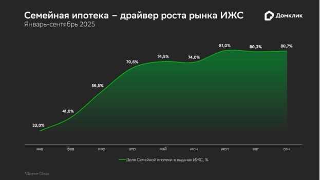 По словам Алексея Лейпи, директора департамента «Домклик» Сбербанка, в III квартале объёмы ипотечного кредитования на строительство частных домов увеличились в 4 раза по сравнению с I кв. 2025 года. Ситуация в сегменте ИЖС была непростой во второй половине 2024 года, когда прекратилось действие программы Господдержка 2020. В этих условиях важную роль стала играть программа Семейная ипотека. Начиная с апреля на эту программу приходилось от 70% до более 80% от всего объёма выдач по ИЖС, что оказало поддержку семьям с детьми, желающим улучшить свои жилищные условия. Рост объемов кредитования ИЖС По итогам третьего квартала общая сумма кредитов на индивидуальное жилищное строительство, выданных Сбером с начала 2025 года, превысила 100 млрд рублей. Причем именно третий квартал стал рекордным – было выдано более половины от этой суммы, 51 млрд рублей. Таким образом, рост по сравнению с первыми тремя месяцами года составил 300%. Существенную долю в выдаче ипотеки на ИЖС занимают программы гос