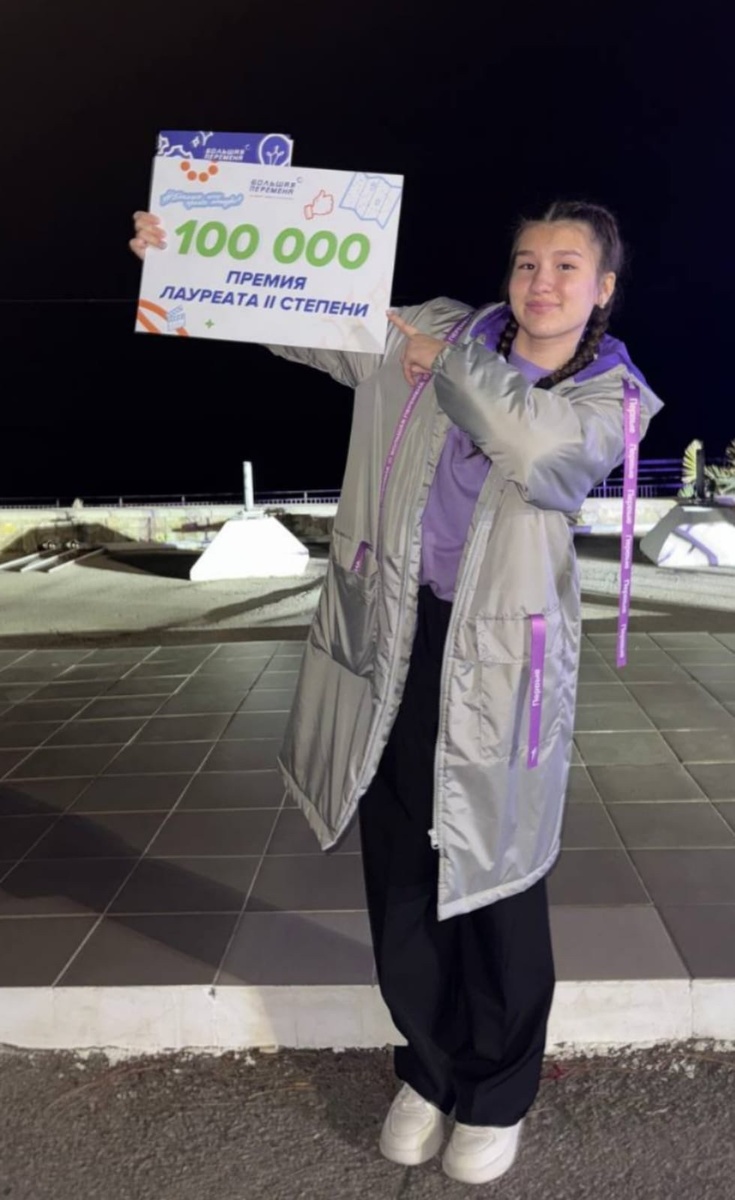 В знаменитом лагере «Артек», который находится в солнечном и тёплом российском Крыму, финишировал конкурс «Большая перемена». Одним из лауреатов всероссийского творческого состязания стала юная жительница Ишимбая Дарья Трамбукина. Девятиклассница школы № 3 была признана лауреатом второй степени. Дарье вручили сертификат на 100 тысяч рублей! В целом ребята из Башкирии достойно выступили в финале «Большой перемены». Среди восьми- и девятиклассников лауреатами первой степени стали двое, второй степени – 16 школьников. Среди десятиклассников лучшими также признаны двое учеников, а второе место заняли 13 ребят из Башкирии. Так что Дарья Трамбукина – в хорошей компании! Ранее «Восход» писал о том, кто подарит ишимбайским школьникам здоровую улыбку. Фото: Дарья Трамбукина