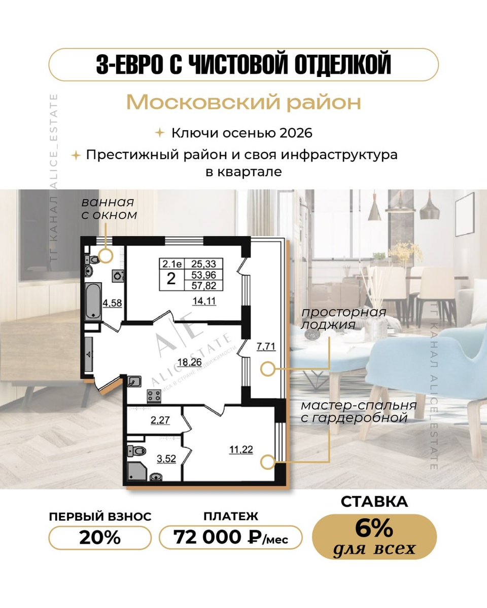 6% для всех: 3-евро с отделкой в Московском районе за 72 000 ₽/мес 🔥 🔽подходит для всех, без детей и льгот 🔽ставка на льготный период 📍 м. Московская - 20 минут Малоэтажный жилой комплекс со своей инфраструктурой и удобный доступом к аэропорту — идеально для семей, которые любят путешествовать. 🔻мастер-спальня и ванная с окном 🔻4 школы и 8 детских садов 🔻свой ресторан в центре квартала 🔻дворы без машин и пешеходный бульвар Подписывайтесь и ставьте ➕, покажем больше проектов со ставкой 6% для всех 💙