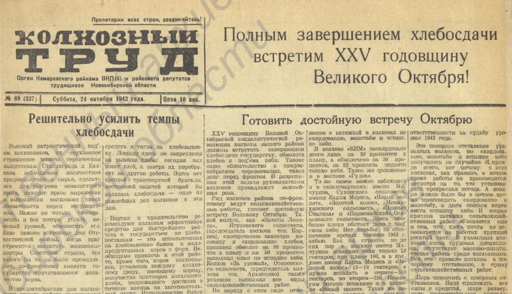 7 ноября – День октябрьской революции. Интересно, как этот праздник отмечали в Кемеровском районе в годы войны. Начинали готовиться заранее – к 7 ноября было принято отчитываться о производственных рекордах – в том числе, и о вывозе хлеба. Интересный факт. Ученики Елыкаевской школы под руководством директора товарища Антонова помогли колхозникам «Новой Зари» заскирдовать хлеб. Учащиеся 5-7 классов после уроков за 2 дня заскирдовали 5 гектаров хлеба. Кстати, если вы не знаете, что такое скирдование. Это укладка сжатых колосьев в кучу для хранения под открытым небом до обмолота. Комбайнов тогда в наших хозяйствах еще не было. Поэтому колосья срезали жаткой или даже серпом, а потом скирдовали. Потом скирды вывозили на то, где зерно молотили механическими молотилками и сушили. Вот так непросто было убирать зерновые в то время.