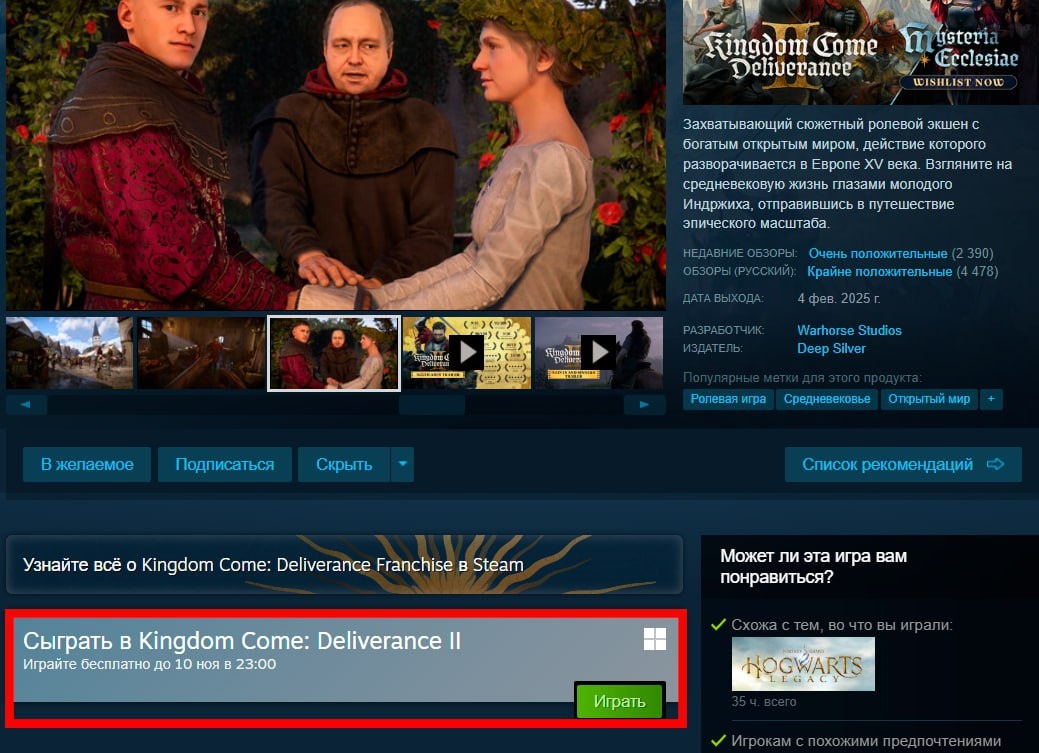 ⚔️ В Kingdom Come: Deliverance 2 дают поиграть бесплатно — начались бесплатные выходные Они продлятся до 10 ноября ➡️ https://vgtim.es/Qw2COeE Можно скачать и на российский аккаунт: 1) Авторизовываемся в клиенте Steam; 2) Открываем браузер и вставляем в адресную строку steam://launch/1771300 3) Жмём Enter и выбираем диск для установки; 4) За это не банят. Также на KCD 2 действует скидка 40%, стандартное издание можно купить за ₸12060 (1,9к рублей).