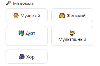 Сегодня мы снова поговорим о создании музыки, но на этот раз сосредоточимся на вокале. Подумайте, какое звучание лучше подойдет для вашего произведения: мужской голос, женский, а может быть, дуэт или даже хор? Также доступен вариант с мультяшным вокалом — он идеально подойдет для детских песен или колыбельных. Всё зависит только от вашей фантазии. Обратите внимание: в этом режиме можно выбрать только один тип вокала.