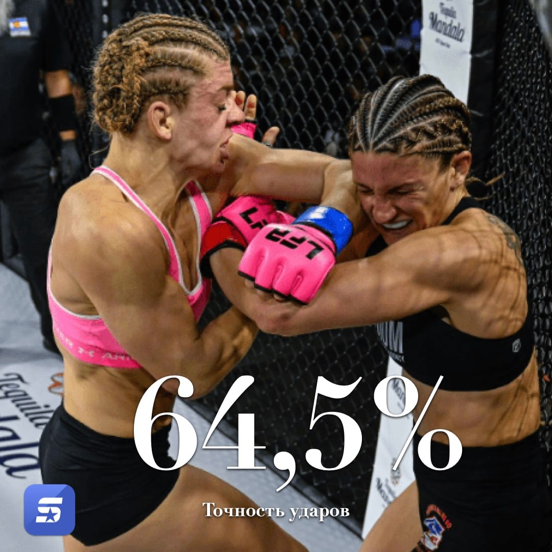 🥊 Чемпионка LFA Шеннон Кларк — бьёт с ювелирной точностью! 64,5% её ударов приходятся точно в цель 💥 56,4% времени она проводит в стойке, 30,2% — в клинче, и 13,4% — в партере. Очевидно, что её сильная сторона — работа в клинче, где Кларк с близкой дистанции наносит соперницам максимальный урон. 🔥 Уже в эти выходные Шеннон Кларк выступит на LFA 211, где будет защищать свой титул и доказывать, что достойна попасть в UFC.
