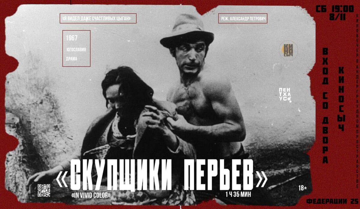 Кинопросмотр Skupljaci Perja / Скупщики перьев | 1967г Режиссёр: Александр Петрович Жанр: драма Страна: Югославия Продолжительность: 1 ч 36 мин 🗓️ 8 ноября 19:00 📍 Пентхаус, Федерации 25, вход со двора Описание: Боро - молодой цыган, который зарабатывает деньги за счет сбыта гусинных перьев в окрестностях города Сомбор, эту территорию он делит с более старшим дельцом Миртой. Гуссинные перья - не единственная причина их конкуренции. Молодая цыганка Тиса становится главной причиной их разногласий. На Западе известен под названием «I Even Met Happy Gypsies» / «Я видел даже счастливых цыган». Гран-при Каннского кинофестиваля, номинант на «Золотой глобус» и «Оскар». 🏷️ свободные взносы #8ноября25@culturnik
