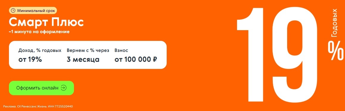Про НСЖ я уже много раз писала у себя на канале, что НСЖ - НСЖ рознь. Есть договора в которые лучше не лезть. А вот короткие договора НСЖ чем-то похожи на вклады с кучей звездочек, тут нет страховки АСВ, но грубо вкладываешь 100к, через 3 месяца если доживаешь, получаешь 19% годовых от этой суммы за вычетом НДФЛ. Если говорить в числах, то это примерно 19% х 90/365 х 0.87=4% от суммы вложения при текущей ставке по Смарт Плюс.