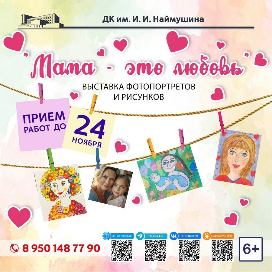 Доброй традицией стал в России День матери, который празднуется в последнее воскресенье ноября. Мама держит своих детей за руку короткое время, но за сердца –вечно. В каждом сердце облик самого близкого человека разный: строгий и добрый, весёлый и серьёзный. Какой образ матери живёт в твоей душе? Приглашаем продемонстрировать уникальность своей мамы на выставке фотопортретов и рисунков «Мама – это любовь», которая состоится 30 ноября в рамках праздничного концерта, посвящённого Дню матери в России. Приём работ: до 24 ноября 2025 года (включительно) по адресу: г. Усть-Илимск, ул. Чайковского, 1. Требования к работам: - размер не менее формата А3; - наличие этикетажа в правом нижнем углу (размер: 11см х 3 см; фамилия, имя автора, возраст). Участие в выставке подразумевает автоматическое согласие на обработку персональных данных. Мамы разные нужны, мамы разные важны. (С. Михалков) Координатор: Байрамова Алёна Сергеевна: (89501487790).