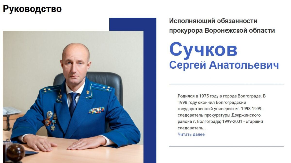 Воронежская прокуратура определилась с временным региональным прокурором. Так, Сергей Сучков уже обозначен как и.о. прокурора области на сайте надзорного ведомства. А еще вчера он вел прием граждан будучи заместителем Николая Савруна. Сучков родился в 1975 году в Волгограде. С ранних лет проявлял интерес к праву и справедливости. В 1998 году окончил Волгоградский государственный университет и начал свою карьеру в прокуратуре Дзержинского района. С 1999 по 2001 год работал старшим следователем, расследуя сложные дела, связанные с бандитизмом и убийствами. Его профессионализм и настойчивость быстро привели к повышению: он стал прокурором зонального отдела, а затем прокурором Ленинского района Волгограда. С 2011 года его карьера стремительно развивалась в Следственном комитете Российской Федерации, где он занимал ключевые должности, включая заместителя руководителя Главного управления в Москве. В 2016 году он возглавил управление обеспечения деятельности органов прокуратуры столицы. С 202