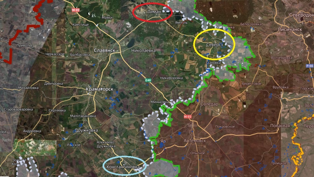 Осень у наших парней выдаётся действительно ударной. Сейчас наши парни фактически взяли два важнейших города (Покровск и Купянск), третий варим в котле (Мирноград), у нас на очереди есть ещё три города, где мы стоим буквально на пороге и которые вскоре также окажутся дома: Константиновка, Лиман и Северск. Ниже расскажем об обстановке в каждом из них: Пойдём с севера на юг: Как видите, города у нас расположены очень плотно, расстояние между крайними городами чуть меньше 50 километров по прямой, что является дополнительной сложностью, так как у противника есть возможность перебросить подкрепления, если ситуация где-то будет ухудшаться. Сначала Лиман: В этом районе сейчас идут упорные бои по всему фронту вокруг города. Наши имеют преимущество, каждый день мы продвигаемся, практически уже заходят в город на восточной окраине (там лесной массив помогает). С севера идут бои за Яровую, Новосёловку, Дробышево. Чуть восточнее за важнейшее село Ставки, взяв которое, можно подойти вплотную к горо