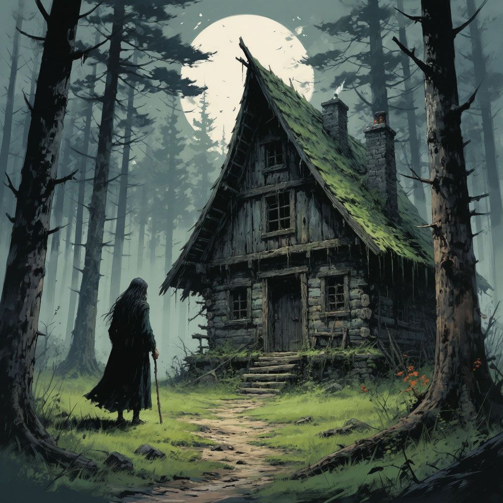 В глухих костромских лесах, где тропы теряются среди вековых елей, а туман по утрам стелется, словно пар от неведомого котла, издавна ходили страшные сказания о Бабе‑Яге. Не та сказочная старуха с пестом да избушкой, что в детских сказках фигурирует, а подлинная лесная владычица — древняя, как сам мрак, и холодная, как зимний ручей. Говорили, что она не всегда была старухой. Когда‑то, в незапамятные времена, была она юной девой из забытого рода, посвящённой лесным богам. За нарушение обета — любовь к чужаку — её прокляли: тело стало сохнуть, кожа покрылась чешуёй, а одна нога обратилась в голую кость. С тех пор она обитает на границе миров, где земля встречается с иной реальностью. Её избушка стоит там, куда не забредают даже самые отважные охотники. Не на курьих ножках — нет. На корнях, что извиваются, словно змеи, и уходят вглубь, к подземным рекам. Вокруг — частокол из человечьих костей, а на кольях — черепа с пустыми глазницами, шепчущие на ветру забытые имена. В середине XVI века