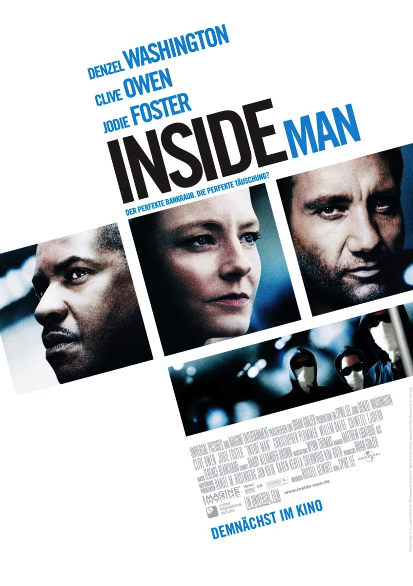Действительно оригинальная идея ограбления банка и накал захвата миксуется с нелепыми социальными комментариями (у нас же не фильм, а урок обществознания) одного из самых больших обиженных чернокожих Голливуда Спайка Ли. Режисер говорит: буквально все мы молодцы, кроме белых мужчин. С героями тут винегрет: решала_кашу_мешала Джоди Фостер, проснувшийся с бодуна Клайв Оуэн и император Дензел Вашингтон. Никогда не понимал хайпа по нему: обычный дядя Денис строит крутышку и своего парня, хотя играть особо не умеет. Как говорится, сначала в Нью-Йорке встает не солнце, а блестящий отполированный зад Вашингтона: ему чуть ли не ботинки целуют. Чистый оверхайп. Сюжет спойлерить не буду, есть необычный монтаж и прочие приемы, и хоть мне лента не понравилась, это 7/10. Советую вам посмотреть и составить свое мнение, после чего расскажите в комментариях. ____________________________ Будь в курсе моих оценок -> ТГ и мой Кинопоиск и мой Дзен