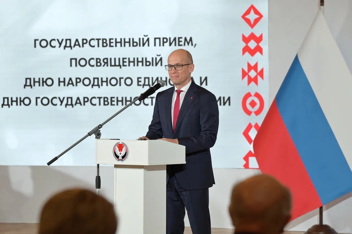 В Доме Дружбы народов состоялся торжественный Государственный прием, посвященный Дню народного единства и 105-летию со дня образования Удмуртской Республики. С наступающими праздниками участников приема поздравил Глава региона Александр Бречалов.
