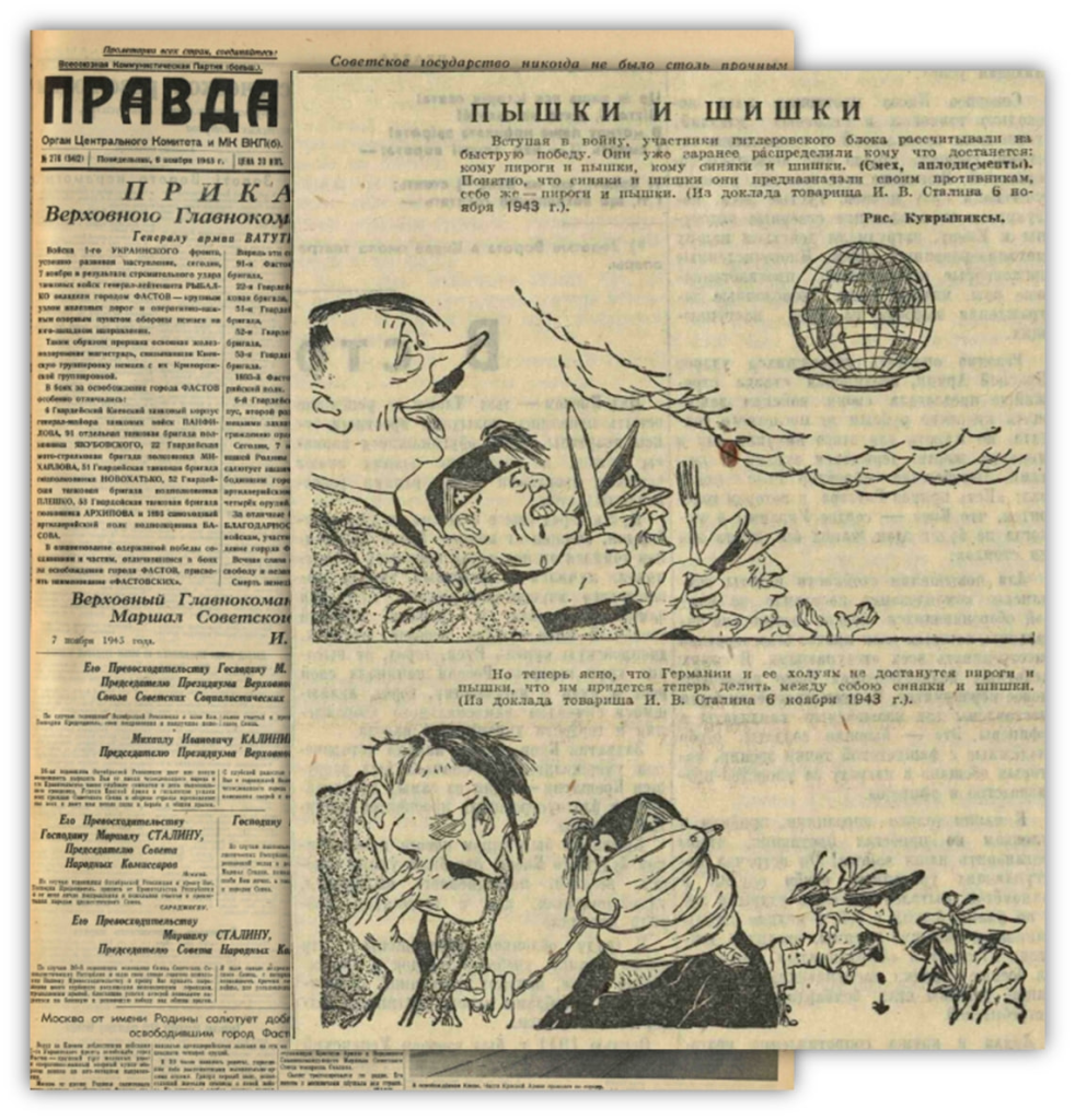 В докладе Сталин обозначил, что 1943-й – это год коренного перелома в войне. Советская армия освободила почти ⅔ советской земли, временно захваченной врагом. Немцы отброшены от Владикавказа до Херсона, от Элисты до Кривого Рога, от Сталинграда до Киева, от Воронежа до Гомеля, от Вязьмы и Ржева до подступов Орши и Витебска.