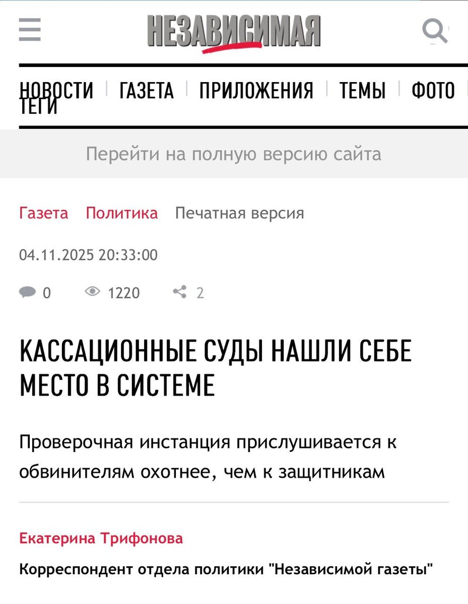 В «Независимой газете» вышел комментарий управляющего партнёра АБ «Немовы и партнёры» Александра Немова - о том, как реально работает кассация (КСОЮ). - Жалоб стало заметно больше, но говорить, что кассация заменила ЕСПЧ не приходится совершенно - Ситуация по стране разная: где-то отменяют решения значительно чаще, где-то значительно реже - при одинаковых правилах это выглядит странно - Представления прокуроров удовлетворяют намного чаще, чем жалобы защиты - Всё чаще отменяют оправдательные приговоры - Лучше всего срабатывает сплошная кассация с очным участием; выборочная - закрытая и непредсказуемая В комментарии предложил, что улучшить: - Чаще допускать дела в выборочной кассации и давать больше очного участия - Выравнивать подход к прокурорам и защитникам - Ускорять рассмотрение жалоб на меру пресечения и переходить на полноценный электронный документооборот #немовы_комментарийСМИ