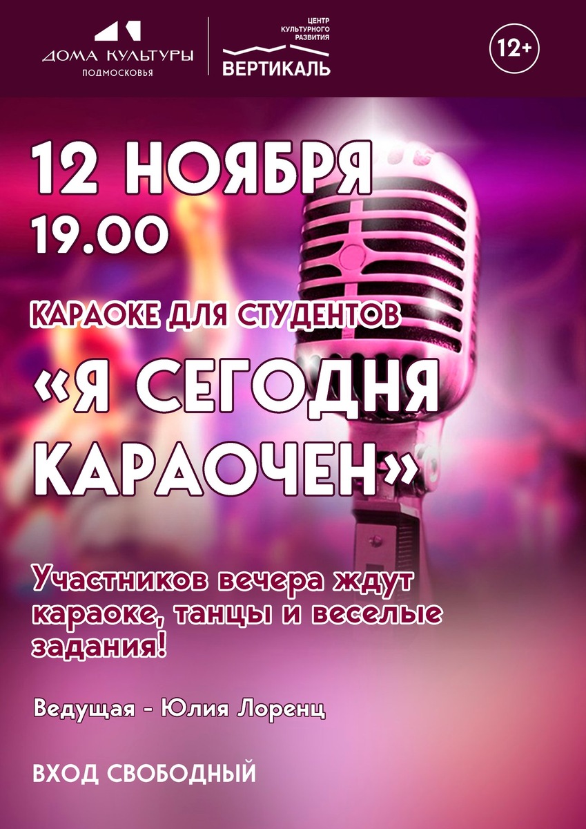 ✨ Приглашаем студентов на караоке вечер «Я сегодня караочен!» 🧩Кроме караоке, мы будем танцевать, решать ребусы, показывать свои таланты. 🎤Что для этого нужно? Просто собрать команду из друзей и подруг, предварительно записаться у администратора ЦКР «Вертикаль» и сказать, какие песни вы хотели бы исполнить на вечере, чтобы звукооператор подготовил фонограммы. 🎤Ведущая вечера — Юлия Лоренц 📆 12.11.2025 🕒 19:00 🏢 ЦРК "Вертикаль" г. Пущино 📍 г.о. Серпухов, г. Пущино, проспект Науки, 7 💰 Вход свободный❗️ ⭐Поддержать канал голосом 💰 Вакансия - курьер в Серпухове ✅ Мероприятия Серпухов https://dzen.ru/id/66f01c6eb4c6fe60c9ca1608 http://vk.com/serpukhov_events http://dzen.ru/serpukhov_events