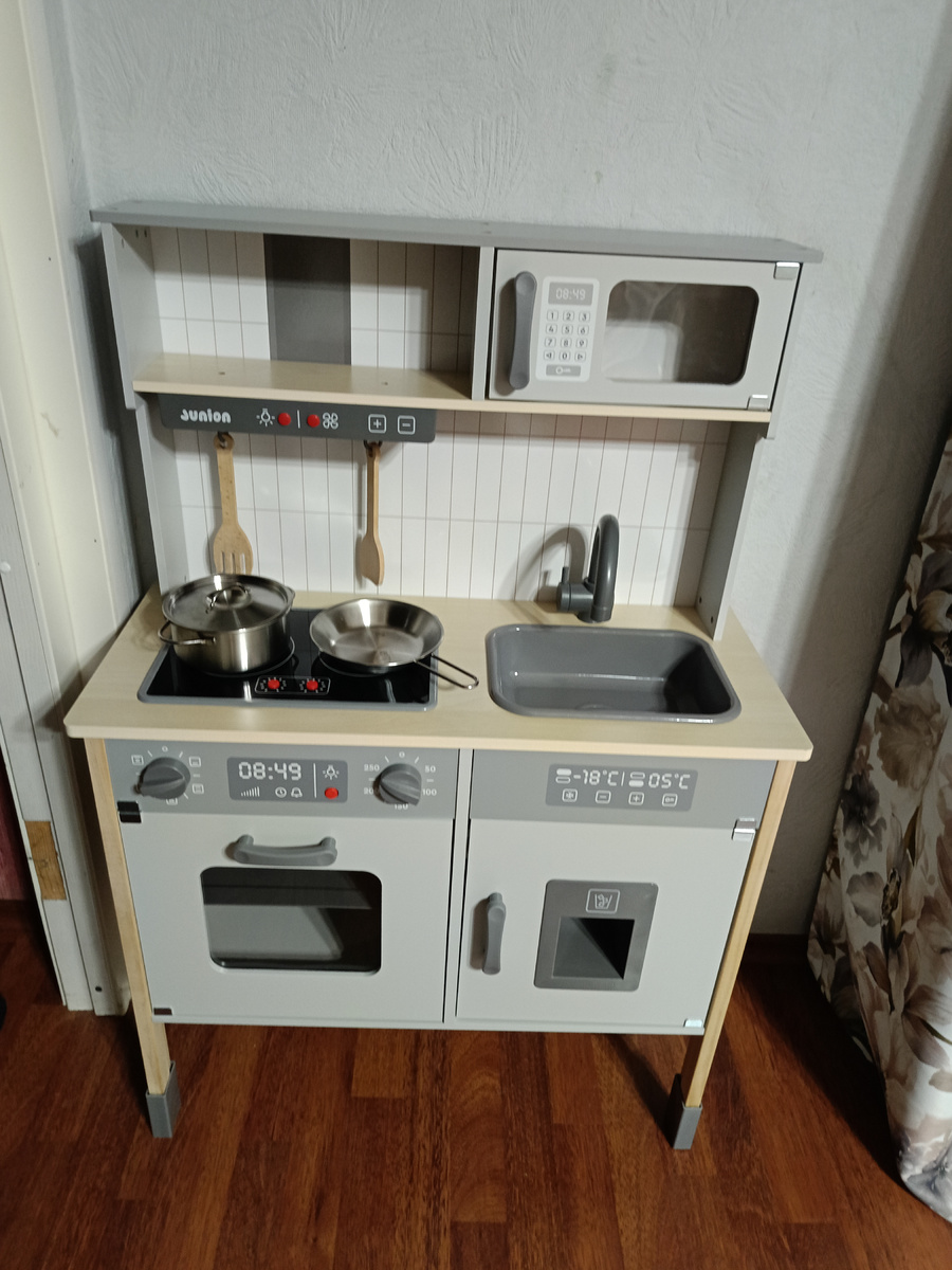 Всем здравствуйте)) У Софийки недавно был день рождения. Одним из подарков была кухня детская из дерева. Скоро Новый год, и я подумала, что обзор этот окажется актуальным кому-нибудь. Помимо того, что она визуально классная , она ещё и очень качественно сделана. Инструкция очень понятная, со сборкой справилась самостоятельно. На видео очень подробно всё показала. По соотношению цена/качество кухня превосходная. 🔥 За 3 тысячи рублей она очень достойная. Сразу скажу, это не реклама, мне никто ничего не платит. Кухню Софийке подарила моя тётя. Точнее она подарила денежку, а кухню мы заказали сами. Я думала сделать подарок Соне на Новый год, но решила заказать сейчас, и не пожалела. Девчонки так интересно , увлеченно играют. Даже старшая к малышне подключилась) В комплекте шла посудка металлическая, лопаточки. Есть даже холодильник с диспенсером, который даёт лед, игрушечный конечно. Плита потрескивает, светится, есть вытяжка, подсветка рабочей зоны. При открывание духовки тоже за