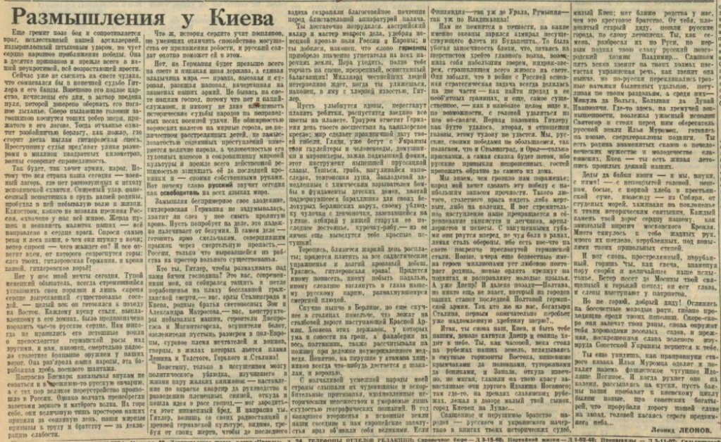 6 ноября 1943 года был освобождён Киев. А 8 ноября газета «Правда» опубликовала статью Леонова «Размышления у Киева». Она заслуживает того, чтобы сейчас, через 82 года, её прочитать и подумать.