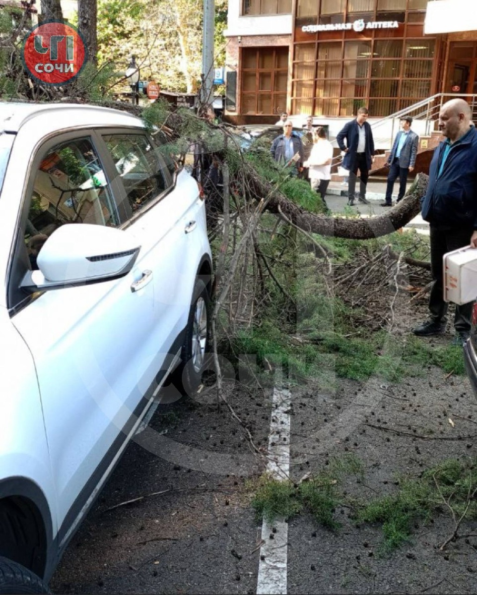 В центре Сочи хвойная ветка упала на дорогу и повредила два автомобиля