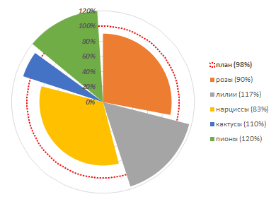 Если хочется быстро понять, как идут дела по плану и факту в вашем проекте — Excel тут незаменим. Инструментов куча, и почти под любую задачу можно придумать что-то толковое. Недавно смотрел разные схемы в интернете, и на сайте Infographer.ru попалась на глаза интересная диаграмма — смесь круговой и лепестковой, идеальная для простого план-фактного анализа. Лепестки здесь не просто красивые: ширина показывает долю статьи в общей сумме, а высота — насколько выполнен план. Самые широкие лепестки — это главные статьи, и сразу видно, где выполнение подходит к 100%, а где не дотянули. Автор примера не дал подробных инструкций, но мне, как фанату Excel, стало интересно — попробовал повторить шаги сам. Взял типичный кейс: анализ продаж цветочного магазина. Кому нужна такая диаграмма — забирайте мой шаблон, он в открытом доступе, скачать можно по ссылке. Сразу добавил красную пунктирную линию — это и есть план, чтобы не гадать, выше ли фактический результат или ниже. Легенду тоже сделал «умно