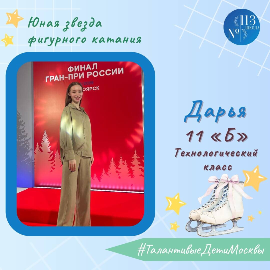 🌟 Юная звезда команды Этери Тутберидзе. Знакомьтесь, ученица 11 «Б» класса - Даша. ⛸️ Даша — воспитанница легендарной школы Этери Тутберидзе, выступающая в одиночном катании, мастер спорта России. 💫 В свои юные годы она уже демонстрирует невероятную технику, харизму на льду и волю к победе — качества, которые отличают всех учениц «Хрустальной» команды. 🤸 Даша показывает сложнейшие элементы, четверные прыжки и вращения высокого уровня. Её программы отличаются особой артистичностью и выразительностью. Даша легко порхает по льду, но за этой лёгкостью и успехами стоит колоссальный труд, ранние подъёмы и бесконечные тренировки. 🏆 В 2024 году Даша стала победительницей чемпионата Москвы, а в 2025 году — серебряным призёром чемпионата России по фигурному катанию. 🤗 Впереди у нее не только новые спортивные достижения, но и одно из самых серьёзных испытаний — ЕГЭ. От всей души желаем ей удачи, сил, здоровья и исполнения самой заветной мечты! ✍️ Классный руководитель 11 «Б» класса Се
