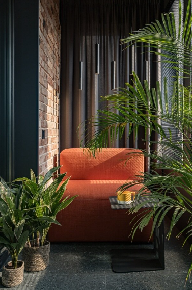 Мебель: Невысокий диванчик или скамья с мягкими матрасами, пуфы, компактный кофейный столик. Текстиль — пледы и подушки, плотные шторы для защиты от солнца. Теплая подсветка — гирлянды, бра, трековые светильники.