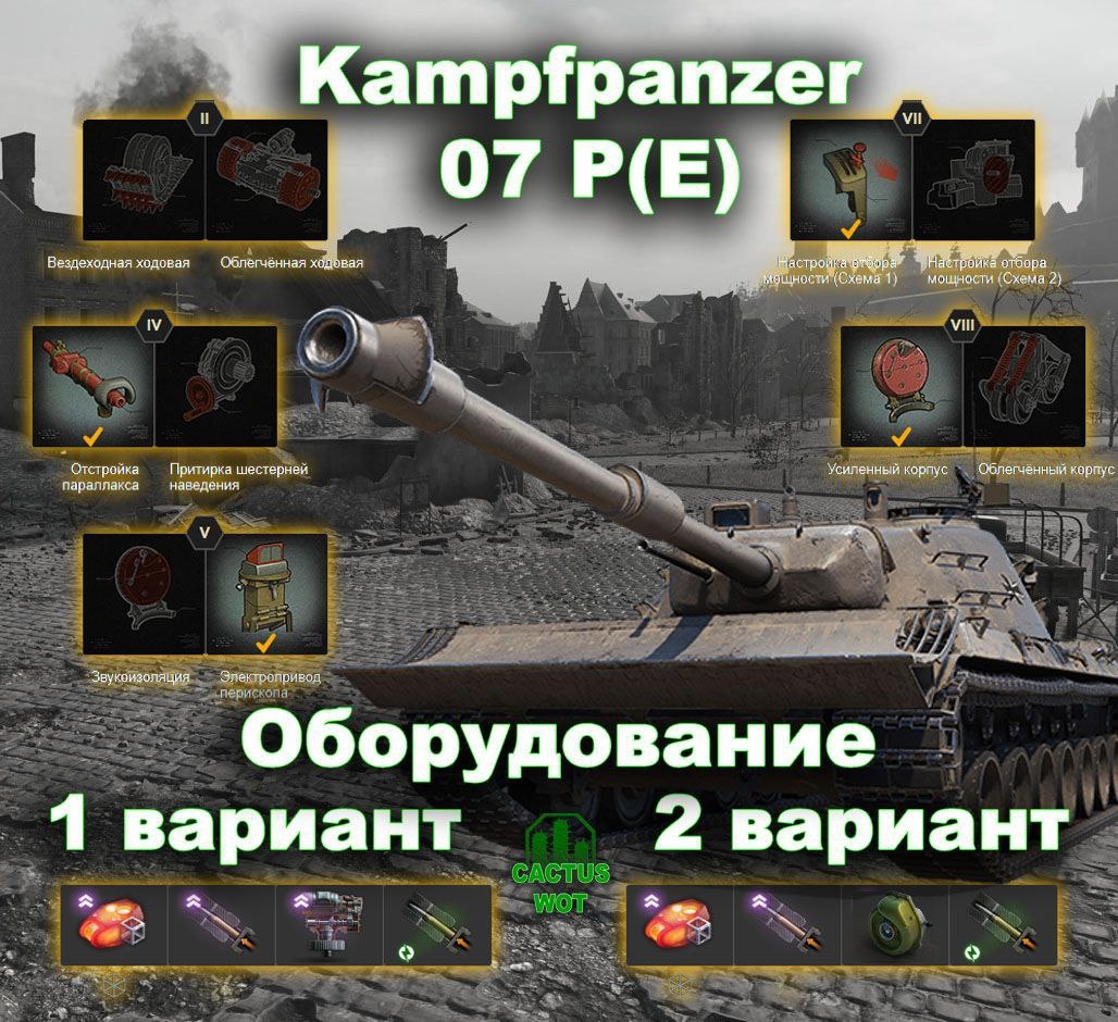 🇩🇪 Kampfpanzer 07 P(E) 🉑Тяжелый танк универсальный 10 уровень. ⛏Оборудование и полевая модернизация на картинке🔼 ➕Плюсы танка хорошая точность (разброс на 100 метров); быстрое время сведения орудия; комфортные УВН; хорошая подвижность; хороший радиус обзора. ➖Минусы танка малый разовый для тяжелого танка; слабое бронирование, роль как универсального танка отыгрывается с трудом. ⬇️⬇️⬇️⬇️⬇️⬇️⬇️⬇️ #базазнаний@CactusWOT #Kampfpanzer07@CactusWOT #миртанков