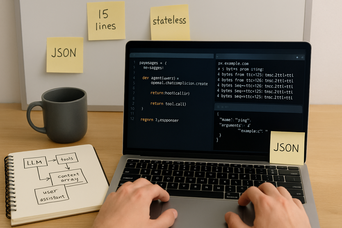 Π ΡΠ΅ΠΏΠ΅ΡΡ Π΄ΠΎΠ±Π°Π²Ρ ΠΊ ΡΡΠΎΠΌΡ ΠΈΠ½ΡΡΡΡΠΌΠ΅Π½ΡΡ (Π½Π°ΠΏΡΠΈΠΌΠ΅Ρ, ping), ΠΈ ΡΠ²ΠΎΠΉ Π°Π³Π΅Π½Ρ ΡΠΆΠ΅ ΠΌΠΎΠΆΠ΅Ρ Π²ΡΠΏΠΎΠ»Π½ΡΡΡ ΡΠ΅Π°Π»ΡΠ½ΡΠ΅ Π΄Π΅ΠΉΡΡΠ²ΠΈΡ. ΠΠΈ MCP, Π½ΠΈ IDE-ΠΏΠ»Π°Π³ΠΈΠ½ΠΎΠ², Π½ΠΈ ΡΠ»ΠΎΠΆΠ½ΡΡ SDK β ΠΏΡΠΎΡΡΠΎ JSON-ΠΎΠΏΠΈΡΠ°Π½ΠΈΠ΅ ΠΈ subprocess.