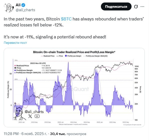 За последние два года биткоин всегда отскакивал, когда реализованные убытки трейдеров опускались ниже -12%. Сейчас показатель на уровне -11%, что сигнализирует о потенциальном отскоке!