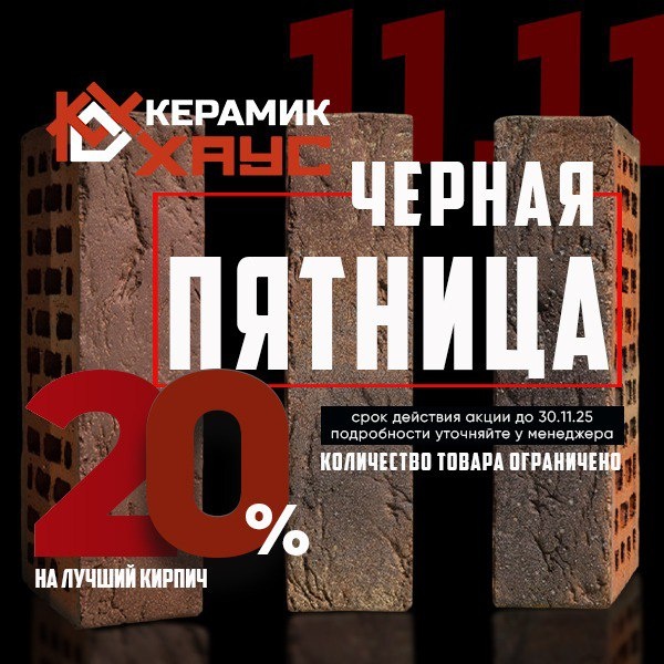 🖤 Чёрная пятница в Керамик Хаус началась! Если вы ждали знак, чтобы наконец выбрать идеальный кирпич — вот он, и он со скидкой 20% 😎 ❗️До 30 ноября можно успеть купить кирпич, оплатить сейчас и вывезти весной до 30 марта!❗️ ☝️А это значит: можно выбрать спокойно, зафиксировать цену и не переживать, что в новом году она "подрастёт" (а она подрастёт 😉). 🎯 В акции — самые востребованные позиции, но количество ограничено! Все подробности уточняйте на наших менеджеров по номеру телефона 📞+7 (928) 282-35-86