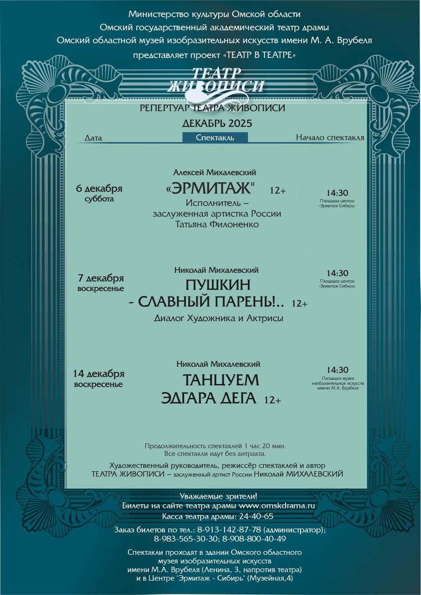 Дорогие зрители! Сегодня, 7 ноября в 15:00 на сайте театра и в кассе театра открывается продажа на спектакли Театра живописи в декабре! Публикуем для вас афишу. Напоминаем, спектакли Театра живописи проходят на двух сценах: на площадке Музея изобразительных искусств им. М.А. Врубеля и в пространстве центра "Эрмитаж-Сибирь". Все спектакли начинаются в 14.30. Место проведения постановок уточняйте на сайте или в афише. Спектакли Омского Театра живописи участвуют в программе "Пушкинская карта". #омскдрама152 #театрживописи